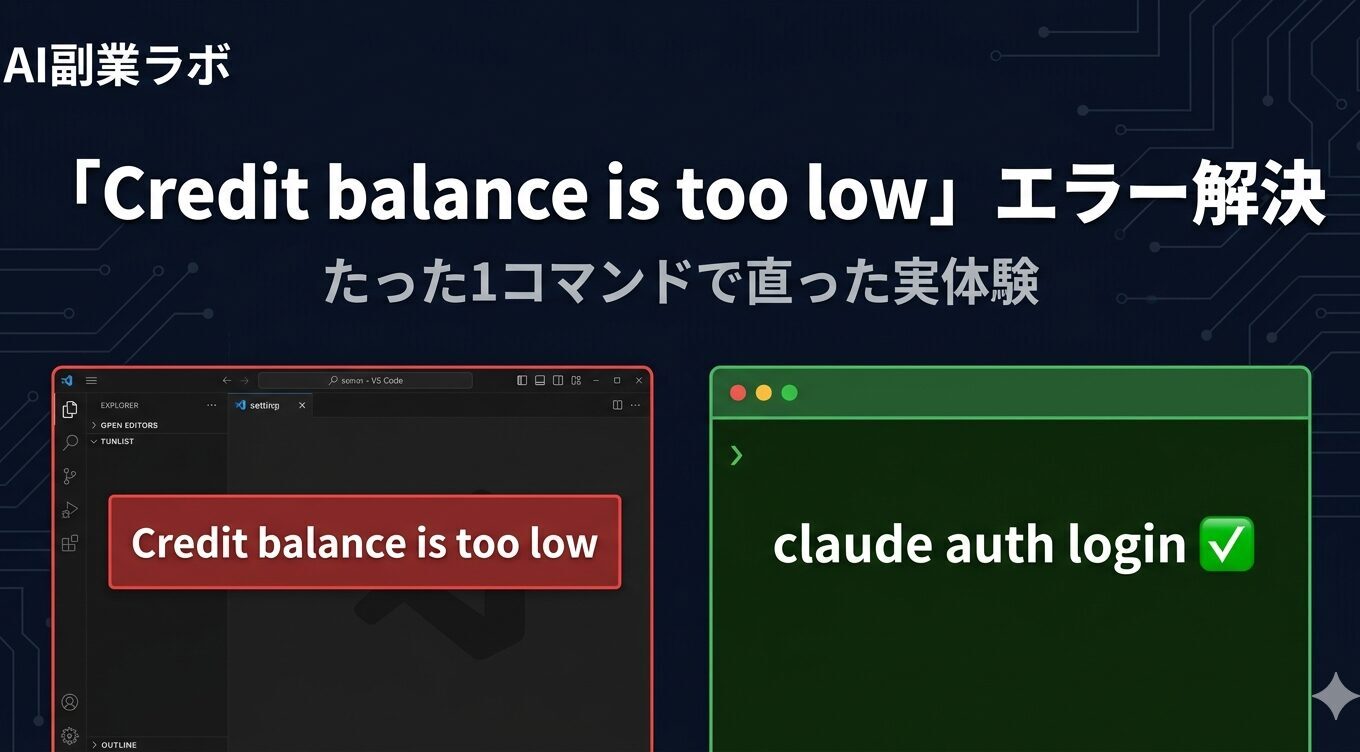 新着記事News 【10分で全部わかる】GoogleのAI講座をyt-dlpで字幕取得→要約|AI・機械学習・生成AIの違いを初心者向けに解説 2026.04.13 AI実験ラボ 実体験】Claude Code「Credit balance is too low」エラーの原因と解決方法|ProプランとAPIの違いも解説 2026.04.13 AI実験ラボ 【2026年版】Claude Code・Claude in Chrome・Coworkの違いを徹底比較|結局どれを使えばいい? 2026.04.04 AIツール活用術 AIツール活用術 AI副業入門 AI実験ラボ 人気記事Popular Post 【無料で遊べる】AIが作ったネオンゲーム「NEON DODGE」 2 views 【2026年版】Claude Code・Claude in Chrome・Coworkの違いを徹底比較|結局どれを使えばいい? 1 views 【2026年版】Claude Codeの始め方|初心者がMacで20分・$5から始めるAI自動化入門 1 views 【2026年版】AI副業とは?初心者が月1万稼ぐまでの全手順 1 views Profile